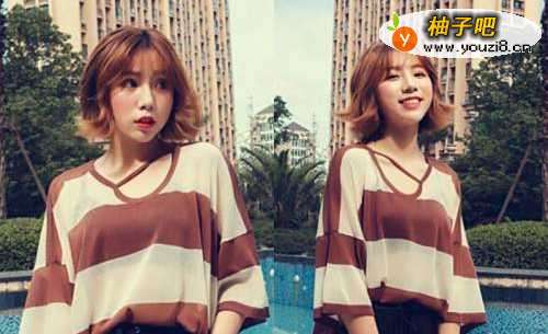 这款发尾设计成非常明显的外翘短波波头甜美度特别的高,头发的长度刚刚在脸蛋下边的位置,额前随性的轻薄空气刘海很好的修饰了脸型,加上奶茶或者棕咖色的发色,更加的灵动可人呢。