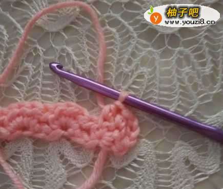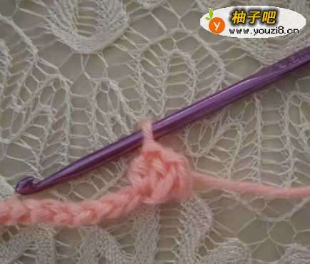 4随后,转行,起三针辫子针。然后钩两针中长针。第一个一个花瓣完成。