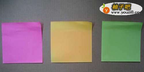 可以把三种颜色的卡纸同时摆出来做。因为这里是准备做两朵花和花的叶子,有相同的折纸方法,可以同时一起做,如下图所示。