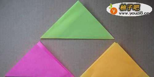 把三种颜色的卡纸,按斜线向上对折为三角形,如下图所示。