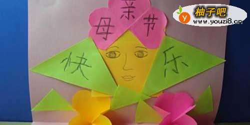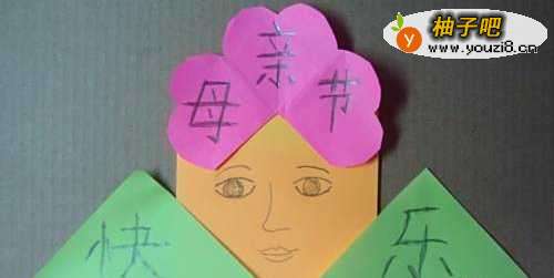 把花形折纸剪掉一个心形,搭配在正方形卡纸上,然后在卡纸上绘制出人物并写上主题词(母亲节快乐),如下图所示。