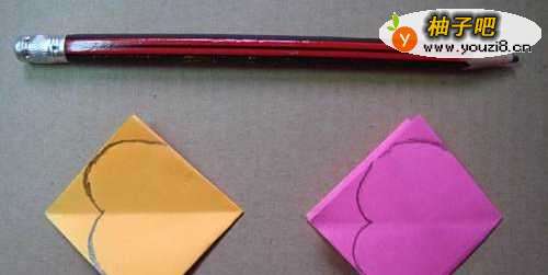 拿出铅笔在正方形卡纸上,画上心形。铅笔沿着正方形的边缘画,要画的对称,这样在展开花时才好看,把如下图所示。