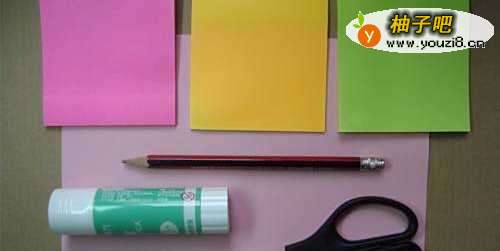 做手工立体贺卡材料有:三种颜色的卡纸、剪刀、胶水、铅笔、彩纸,如下图所示。