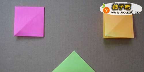 颜色卡纸展开后,将颜色卡纸对半折两次,折为正方形,把绿色卡纸按三角形对折两次,把如下图所示。