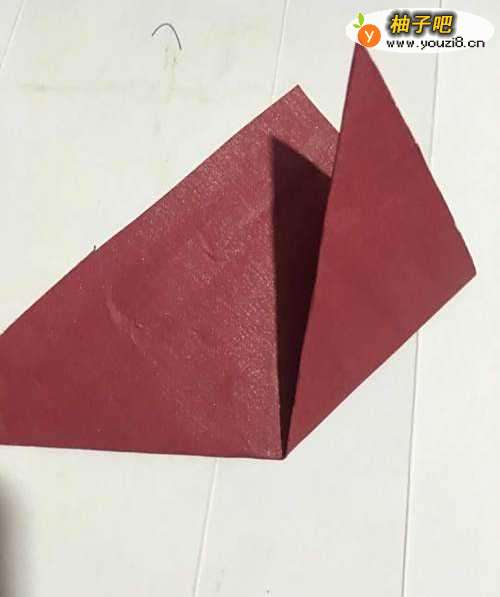 第一步 把一张正方形紫色彩纸从下向上对角折 再把右边角向上折纸上角 旋转一下上下翻 然后再从下向上对折