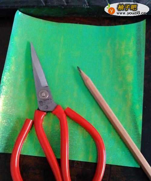 我们准备一把好剪刀,一支铅笔,一张绿色的彩纸备用。