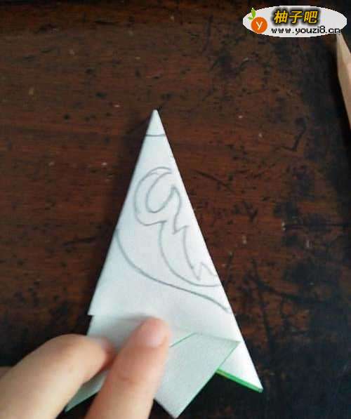 7我们把折好的折纸倒过来,然后在彩纸上画上我们想要剪得嫩芽的图样。
