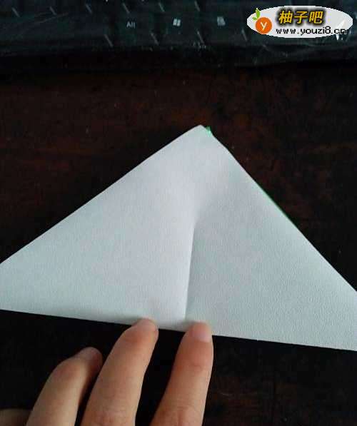 2我们首先要把彩纸的反面向上,然后把彩纸的对角线对折。