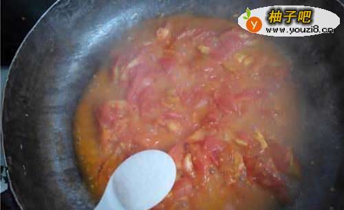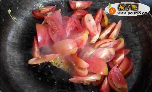 7在把西红柿放入锅里翻炒出水。