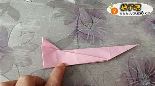 6我们把彩纸从底下撑开,把右侧的角折到里边去,一架航天飞机就折好了。