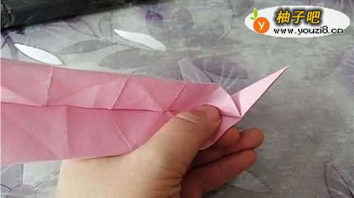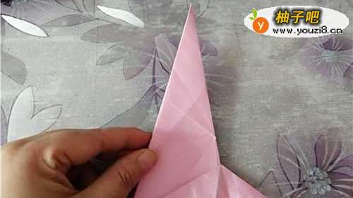 3再把下面右侧的边向下折,然后把中间的角捏起来。