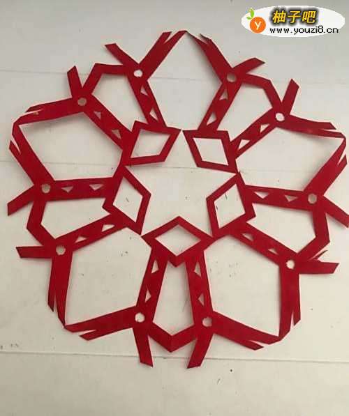 7第七步 剪完外围多余的彩纸之后 再剪里面的细节部分 镂空部分 修边部位 还有其它涂实的地方 全部剪完之后 展开压平 一副漂亮的几何体花纹样图案就裁剪完成了