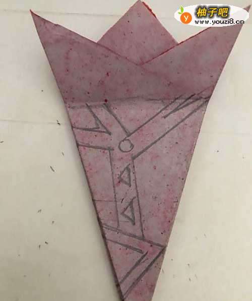 儿童手工启蒙剪纸 一副美观的几何花图案 怎样用彩纸裁剪 预备材料 正方形彩纸一张 折叠方法 按照五角星的基本折法 然后再在上面画上简单的不规则的三角形 圆形 菱形 长方形等等 画好之后 用手工剪刀剪下即可