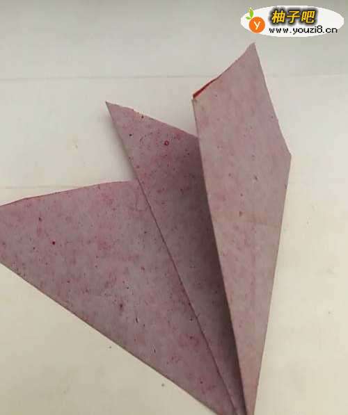 第一步 把一张边长为16厘米的正方形红色彩纸 先把它从下向上对角折叠 然后再从右向左对角折叠