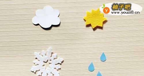 3在白色、蓝色卡纸,黄色、白色不织布上分别画出云朵、雨滴、阳光和雪花的形状,用剪刀剪下备用。