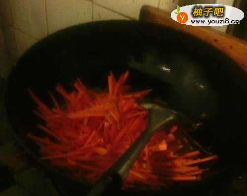 4炒肉丝时,等肉丝炒成八成熟时可先加入2克盐和酱油翻炒1分钟。