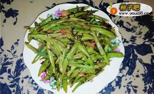 5倒入眉豆和香肠炒,加入适量的盐和酒,放一点梅干菜