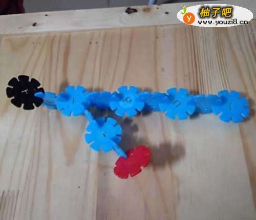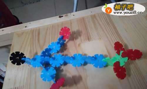 4第四步:用蓝色和红色的雪花片拼出飞机左边的翅膀,如下图所示
