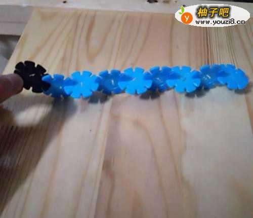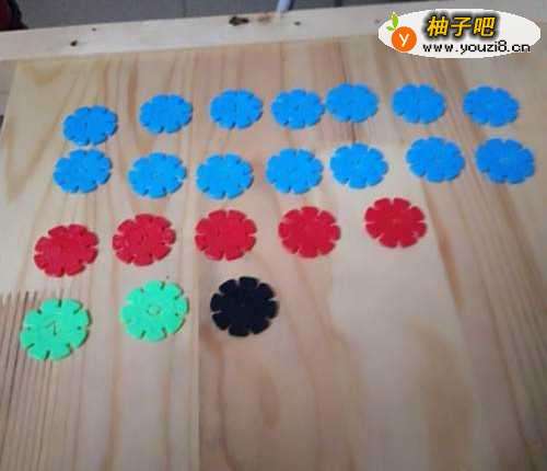 第一步:先准备好蓝色雪花片14片,红色雪花片5片,绿色雪花片2片和黑色雪花片1片(也可以根据孩子喜欢的颜色进行选择)如下图所示。