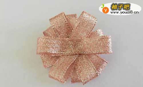2裁6条10CM长的丝带,打火机烧下边,把6条丝带折成下图的样子,用针线缝合固定