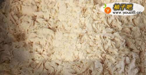 2往面粉中打入1个鸡蛋,少许盐,放牛奶,加入少许清水,搅拌成小絮状