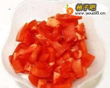 西红柿十字刀,用开水烫一下,剥皮,切丁备用,蒜切片,备用