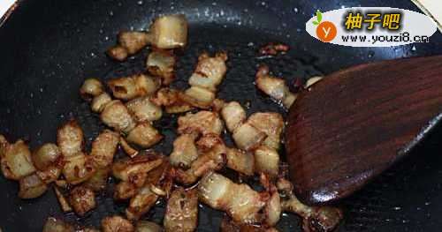 3锅里倒油烧热,放入五花肉翻炒,慢慢可以炒出一点油,立刻捞出备用。