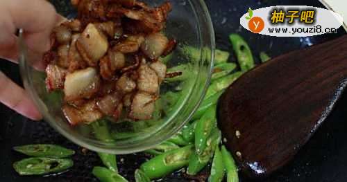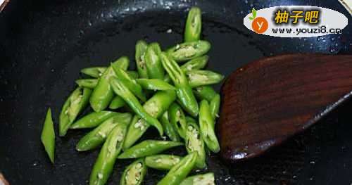 4锅里剩余的底油不要倒掉,放入切好的杭椒翻炒。