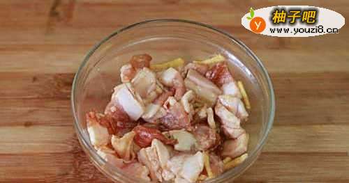 2五花肉加入料酒,生抽搅拌均匀,腌制10分钟。