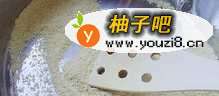 4黄豆面倒到锅中翻炒,炒成金黄色,并有一点点糊味。(有糊味≠ 炒成黑色)