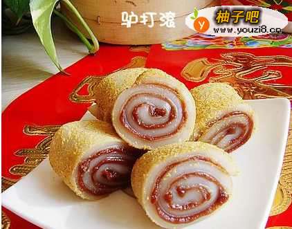 驴打滚,是北京小吃中最古老的品种之一,它的原料是用黄米面加水和软、蒸熟。另将黄豆炒熟后,碾成粉面。制作时将蒸熟的黄米面粘上黄豆粉面,再擀成片,然后抹上赤豆沙馅(也可以用红糖)卷起来,切成100克左右的小块,撒上白糖就成了。制作时要求馅卷得均匀,层次分明,外表呈黄色,特点是香、甜、黏,有浓郁的黄豆粉香味儿。 豆面糕以黄豆面为主要原料,故称豆面糕。但是,为什么又称为驴打滚呢?这是一个形象的比喻,将黄米面放在黄豆面中滚一下,如郊野驴打滚时扬起灰尘似的,故而得名。