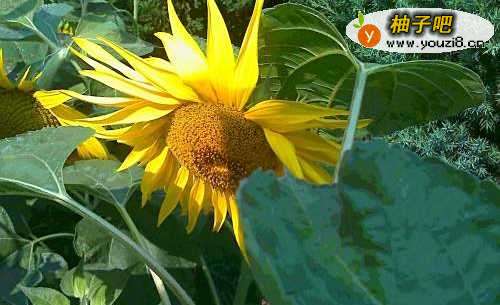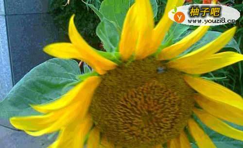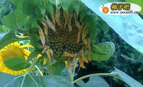 2向日葵花的枝叶有大大绿色的叶子托着黄色的花瓣,就是样黄色的花蕊内的果实成熟,