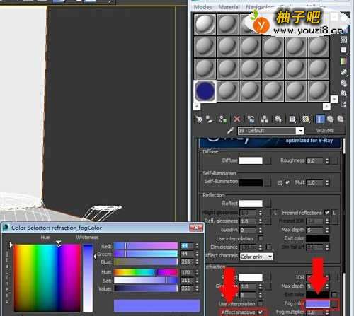 5如果想渲染有颜色的玻璃,比如说蓝色玻璃,如图把”反射率“下面的”雾颜色”改成蓝色,然后把左边的“影响阴影”打钩(这一步很重要哦~)