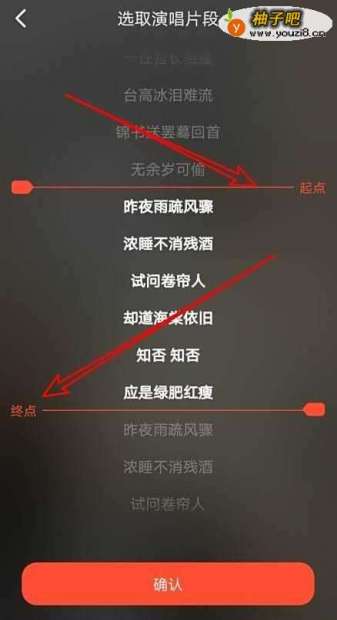 7这时就会打开选取演唱片段的页面,在页面中拖动起点与终点的选择条,就可以方便的调整要演唱的音乐片段了。