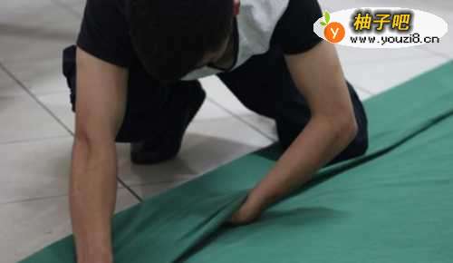 切就是用手掌的肉厚部分来切被子,把裤子的印切出来。有些同学往往在这一环节做不好,好多人都是用手指来捏,这样是叠不出形的。