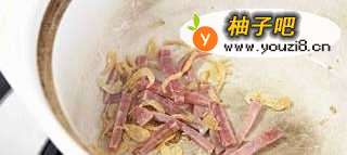 3在锅中放入少量食用油,放入生姜,待爆香后倒入火腿丝和虾皮