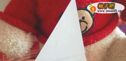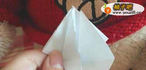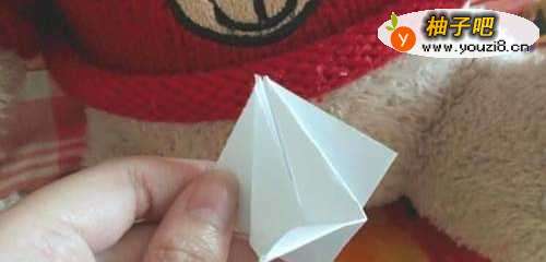 6将其中下边打开,如下图所示将边缘部分沿中间点向里折