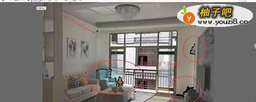 2分别对照片中需要挂入窗帘的位置进行“新建选区”与“透视调整”。选区建立时多取点绕开沙发等障碍物,透视调整找准墙面四个角落即可;