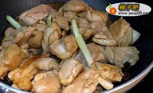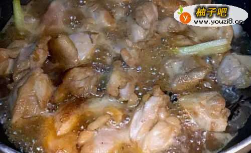 2锅中加入约2小匙油,倒入冰糖,开中小火冷锅冷油加热,等待冰糖融化并开始转为褐色,快速地将鸡肉皮朝下加入锅内,然后快炒上色