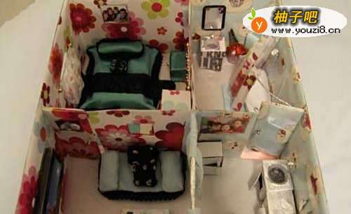 将鞋盒做成一个房间,给里面放上小桌子,小床,小玩偶,旧鞋盒变身成过家家的游戏屋,超有爱。