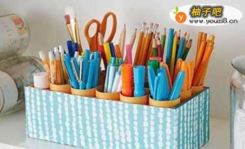 相信有小孩的家庭都知道,小孩子都有一大堆各种各样的笔。针对这些笔,我们可以用纸筒配合鞋盒,将这些笔明确分类。