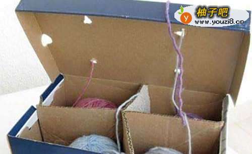 所以可以把毛线团放在鞋盒里,在鞋盖上钻几小个孔,毛线从小孔里串出来,避免毛线团乱滚。