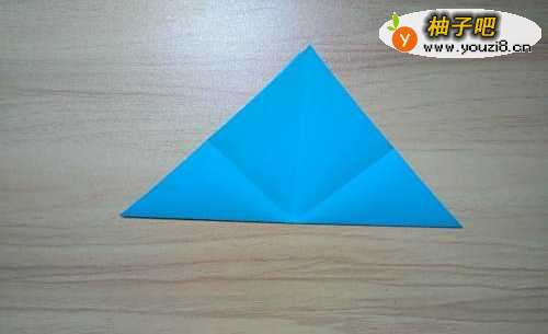 6翻到反面,沿箭头所指的对角线从左下角往右上角对折。