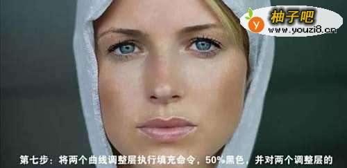 7将两个曲线调整图层执行填充命令,50%黑色;并对两个调整层的蒙版部分进行两次0.5的高斯模糊,以柔化选区的边缘;
