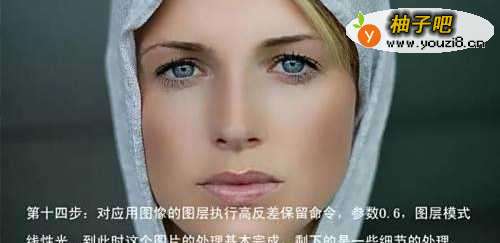 14对应用图像的图层执行:滤镜 > 其它 > 高反差保留,参数为0.6。图层混合模式为“线性光”。到此时这个图片的处理基本完成。剩下的是一些细节的处理,如唇线、眼线等;