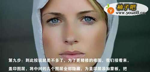 9到此按说就差不多了,为了更精确的修图,我们接着来盖印图层。将中间的几个图层全部影藏,为盖印图层添加蒙版,把不是皮肤的地方擦回来,这样更真实一些;