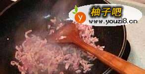 23—5秒后就可以把肉放进锅了,搅拌几下,火开大点,就可以把一勺白酒放入锅中搅拌四五下就可以放盐了。