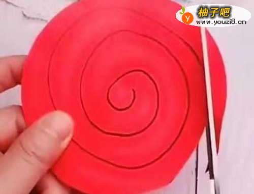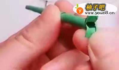 4用绿色彩纸卷成小棒。把一头剪开。粘上花朵。见下图
