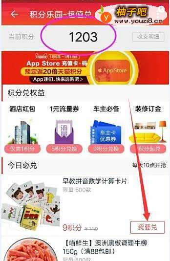 5如图所示未显示目前本淘宝账号的天猫积分,在天猫购物的订单需要确认收货后才会得到商家承诺的积分。如图所示天猫积分兑换也经常有很多活动,可以用积分抵一部分钱,也可以直接用低分全额兑换。找到一款自己喜欢的产品点击我要兑。