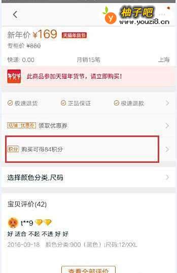 9当我们在浏览一款商品时,如果知道这款产品是否会赠送天猫积分呢?如图所示,在宝贝价格及优惠信息后,会显示本款产品如果购买会得到多少积分。